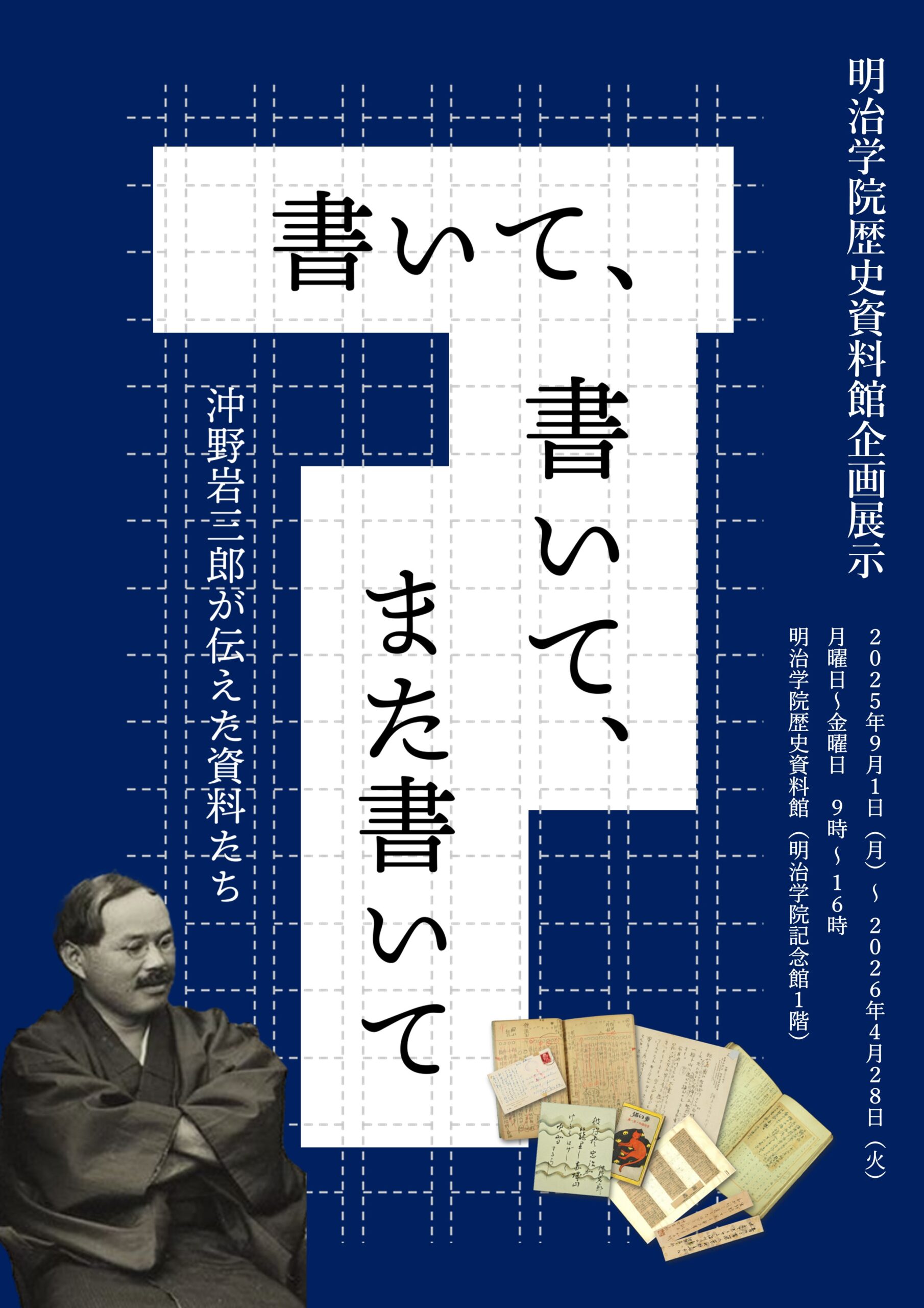 沖野岩三郎(1876-1956)は作家、牧師として知られます。1907(明治40)年に明治学院神学部を卒業し、その後も学院との関係を大切にし続けた人物です。1952(昭和27)年、沖野は自身の蔵書や原稿類を学院図書館に寄贈し、後年原稿類が歴史資料館に移管されました。本展示では、沖野より受贈し守り継いできた原稿たちを展示し、独特の筆跡や原稿用紙の使い方といった直筆資料ならではの魅力をご紹介いたします。自らを「文筆労働者」と称し、日々ひたむきに原稿用紙に向かい、幅広い分野の著作を残した沖野岩三郎。力のこもった原稿たちをぜひご覧ください。